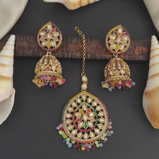 Antique Full Multi Stone Mehendi Polish Clustered Pearl Party wear Maang Tikka