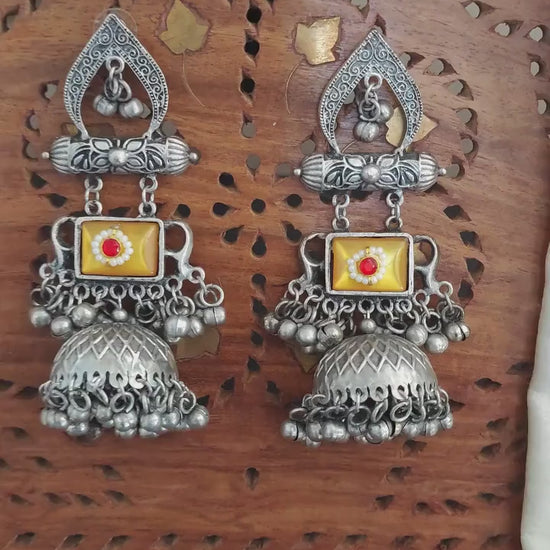 Designer Full Stone German Silver Jhumka Yellow Earrings